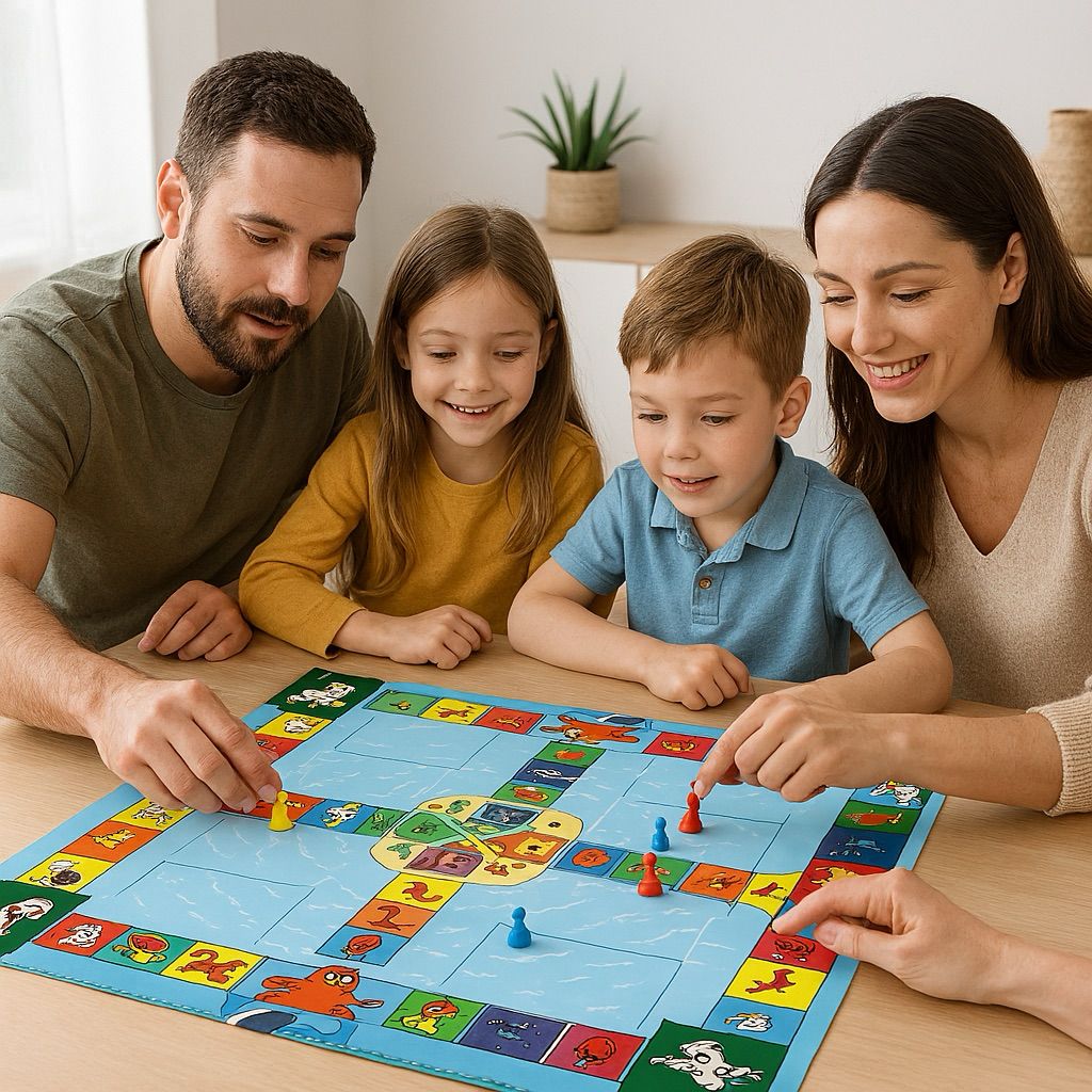 This is a tabletop board game that needs to be physically manipulated. It involves tossing a die and moving wooden pieces around a board. Two and up to six players can play.