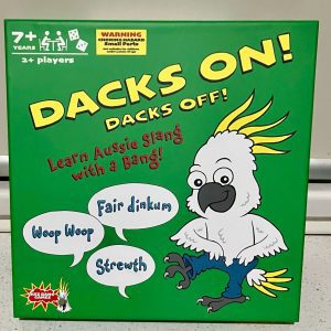 To play “Dacks on Dacks Off, you don’t need to know all the Australian Colloquialisms. You just need to have a go. Choose between a timed game, a short game or a long game. Collect at least one card from every category (after answering the question correctly or guessing it!) Once done, you can then make your way to the centre Beach Boxes and yell, “Dacks On”! Don’t forget if you land on the Dunny you will be penalized (maybe you will lose a card). But if you land on the Surfer you could get a huge advantage! Once in the centre, if you decode the Aussie slang correctly, you are the winner, winner, Chicken dinner!
